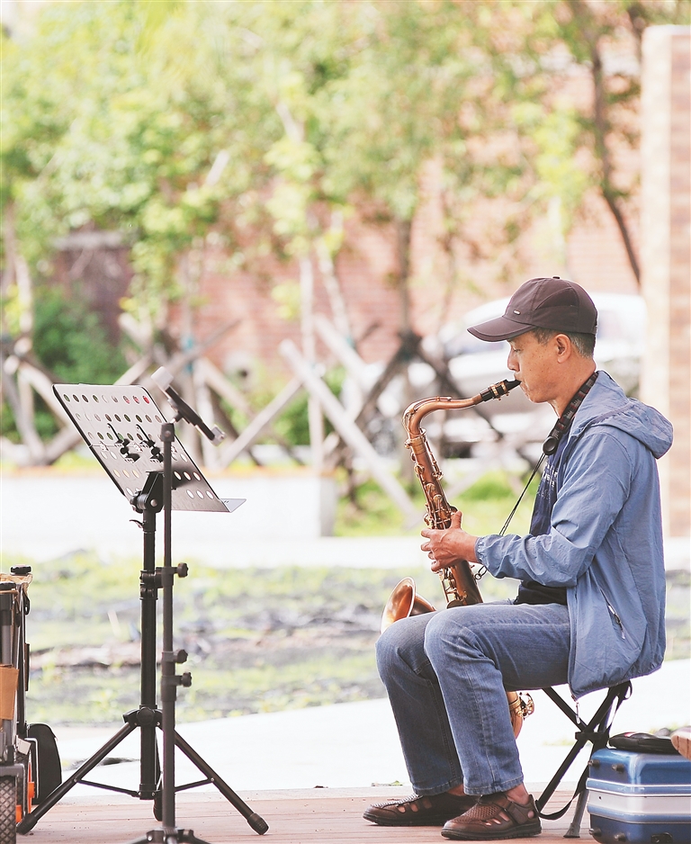 今年5月初,在公園正面廣場上,記者就看到了幾個玩電音的市民,自彈自唱自演。4日,在公園的游廊區(qū),一幫老年人在吹拉彈唱;一個涼亭內(nèi),三個中年大叔和一個年輕小伙合奏著薩克斯;正在鋪磚的一處休閑椅上,年齡和性別參差不齊的四五個人,也在合練著曲目……