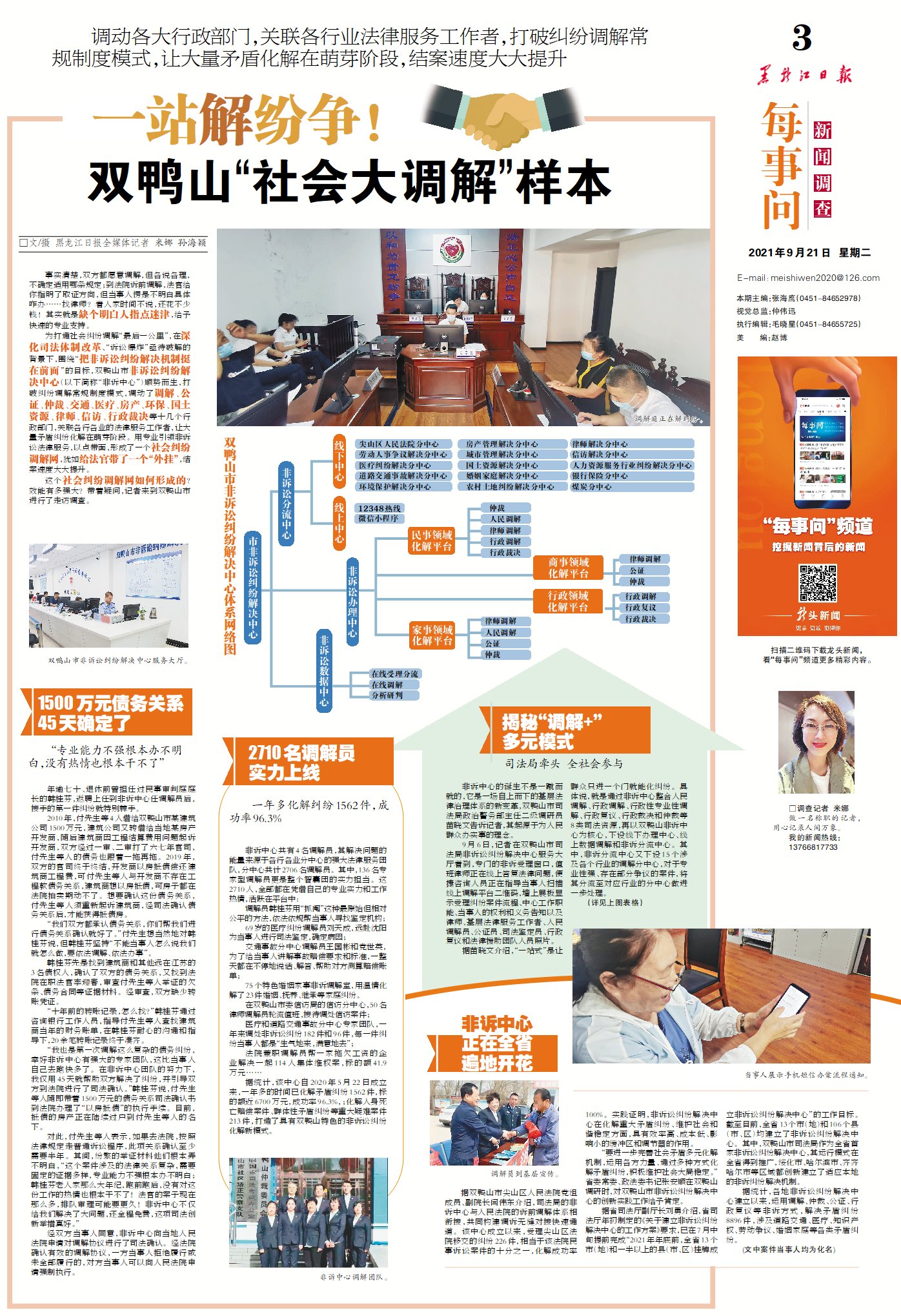 9月6日,記者在雙鴨山市司法局非訴訟糾紛解決中心服務大廳看到,專門的非訴受理窗口,值班律師正在線上答復法律問題,便捷咨詢?nèi)藛T正在指導當事人掃描線上調(diào)解平臺二維碼,墻上展板顯示受理糾紛案件流程、中心工作職能、當事人的權利和義務告知以及律師、基層法律服務工作者、人民調(diào)解員、公證員、司法鑒定員、行政復議和法律援助團隊人員照片。