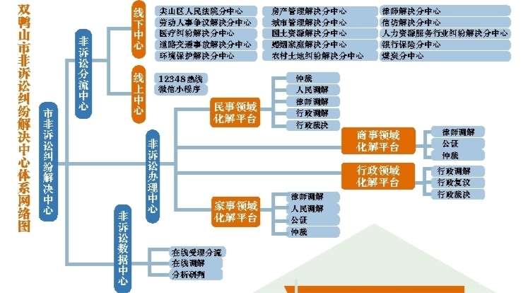 據(jù)苗曉文介紹,“一站式”是讓群眾只進一個門就能化糾紛。具體說,就是通過非訴中心整合人民調(diào)解、行政調(diào)解、行政性專業(yè)性調(diào)解、行政復議、行政裁決和仲裁等8類司法資源,再以雙鴨山非訴中心為核心,下設線下辦理中心、線上數(shù)據(jù)調(diào)解和非訴分流中心。其中,非訴分流中心又下設15個涉及各個行業(yè)的調(diào)解分中心,對于專業(yè)性強、存在部分爭議的案件,將其分流至對應行業(yè)的分中心做進一步處理。